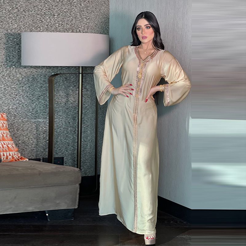 Elegant beige satin abaya with golden embroidery on neckline and cuffs. Ideal for visits and formal gatherings.