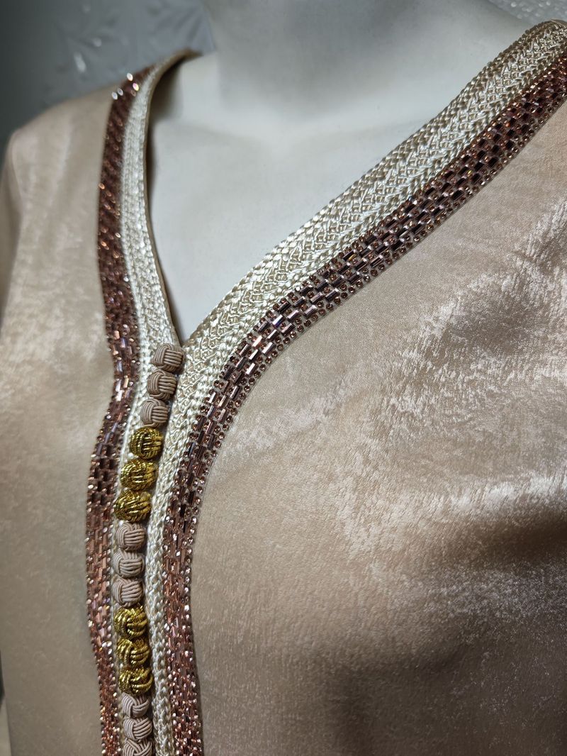 خامة ساتان ناعمة بلون بيج ذهبي تعكس الإضاءة بجمال، مع تطريز ذهبي أنيق من الأمام وعلى أطراف الأكمام.