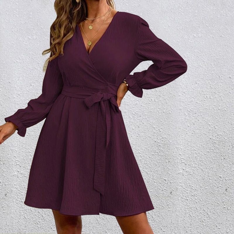 فستان نسائي بلون صلب بنمط لف الصدر مع أكمام لانترن وشريط عنق منقسم