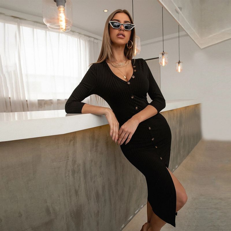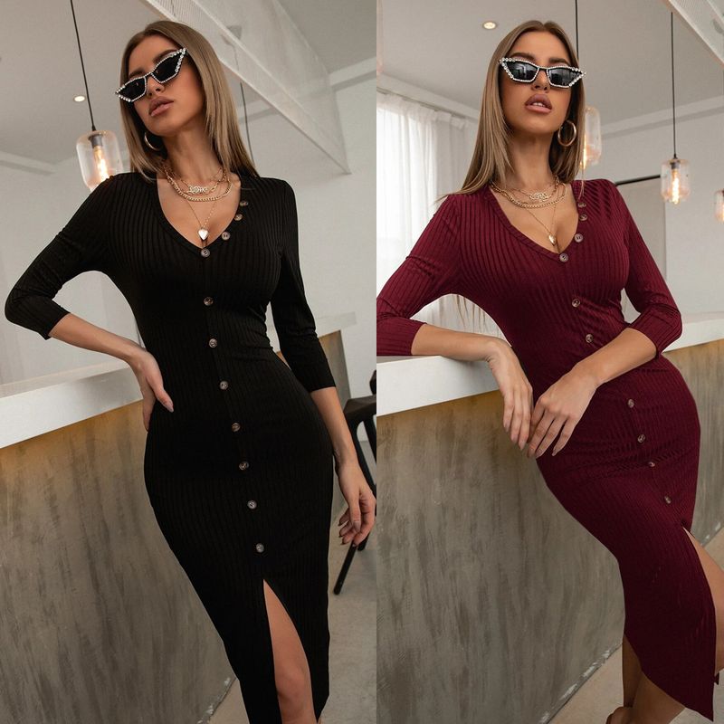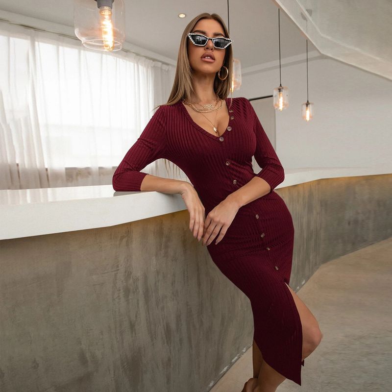 فستان نسائي أنيق بقصة V-neck ومزود بأزرار ونسيج مطاطي، تناسب خصر رفيع ويغطي الوركين بنمط ملفوف.