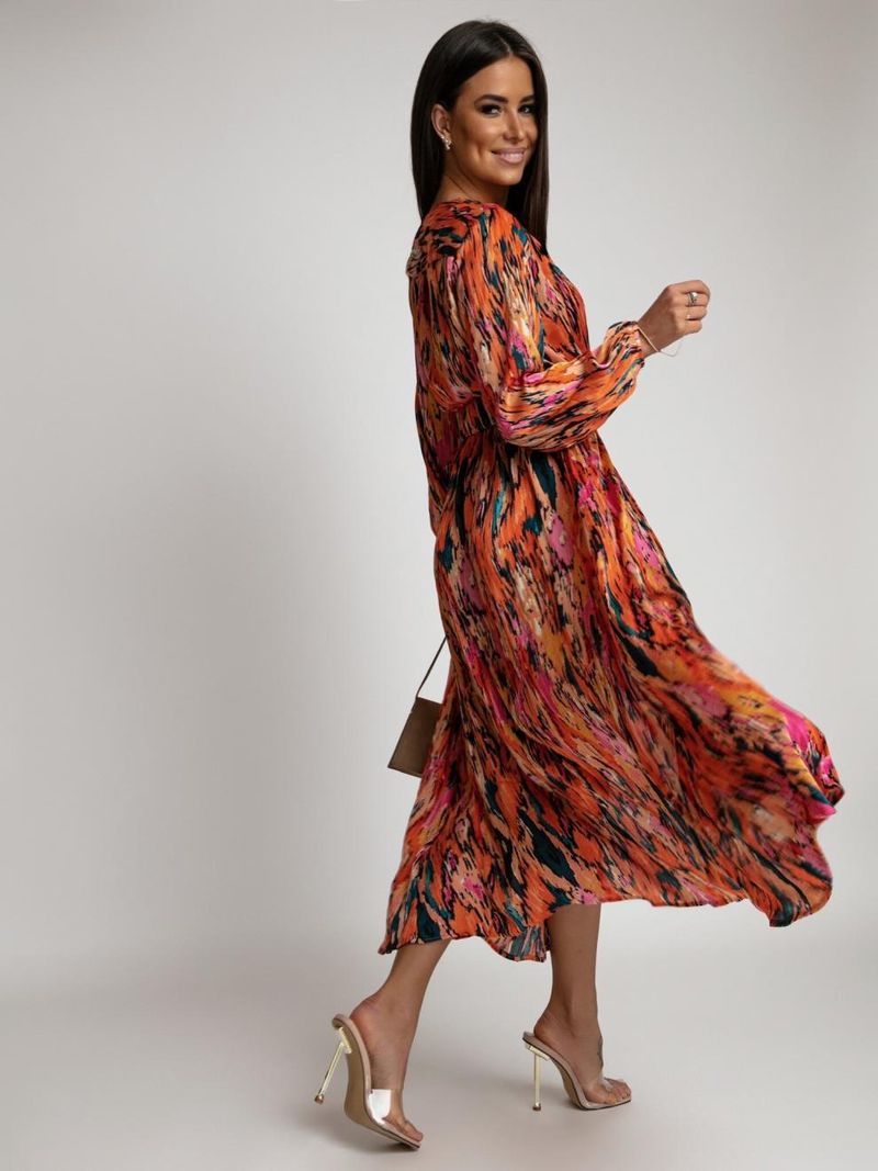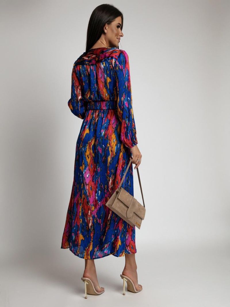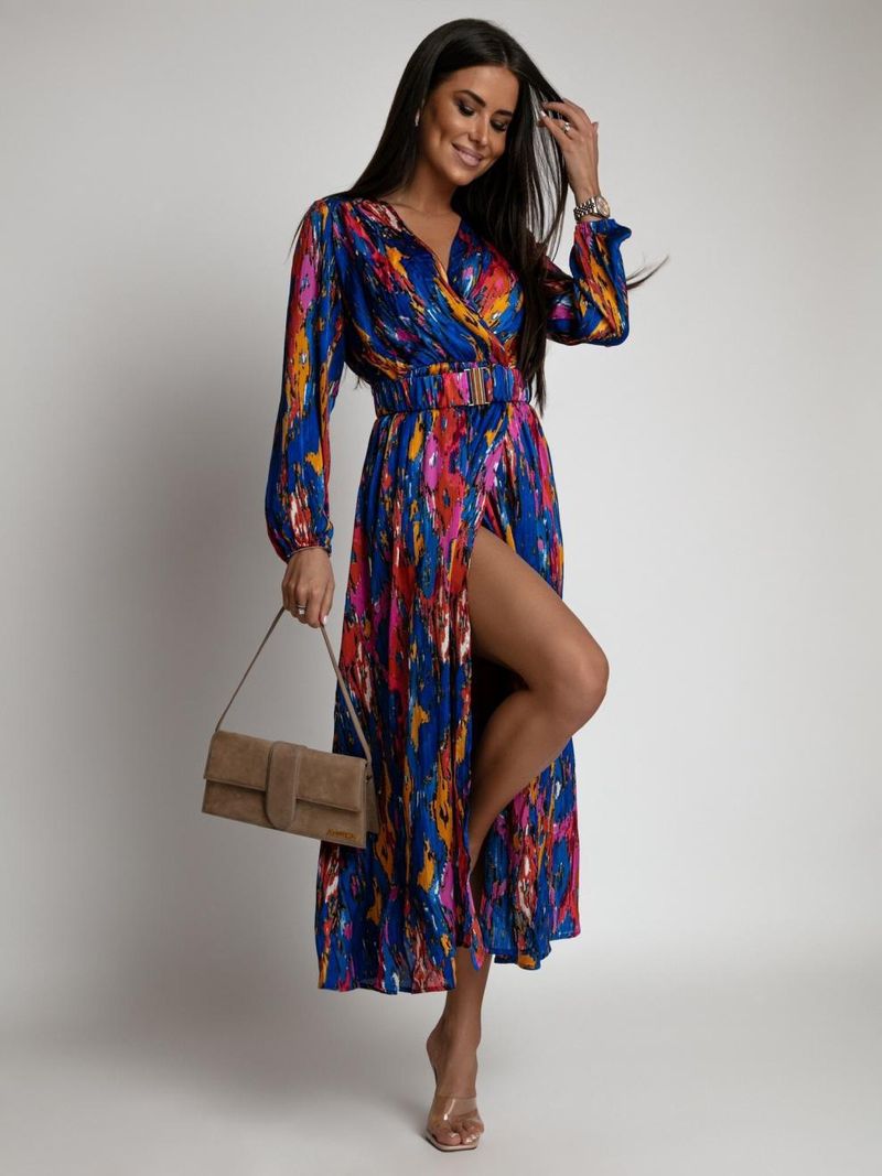 فستان بأكمام طويلة ورقبة على شكل حرف V مطبوع بأسلوب الموضة النسائية مع حزام