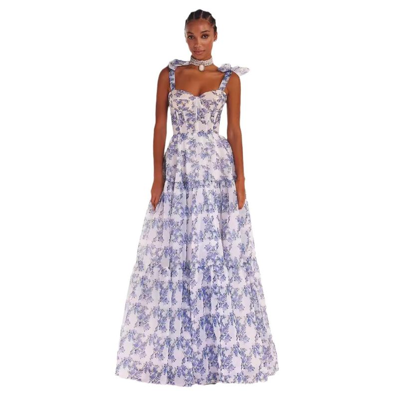 ثوب من التنورة المتأرجحة الكبيرة بتصميم بدون أكمام ومزين بالزهور، مع حزام مائل وقماش الأورганزا لملابس النساء.
